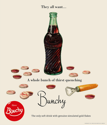 Wherever they come from, those genuine simulated gold flakes sure lend glamour to the soft drink in this reproduction of the original Bunchy “One is not enough” ad from 1957. Released in June 2012, the piece is part of a unique giclée print edition of vintage Bunchy advertisement campaigns.